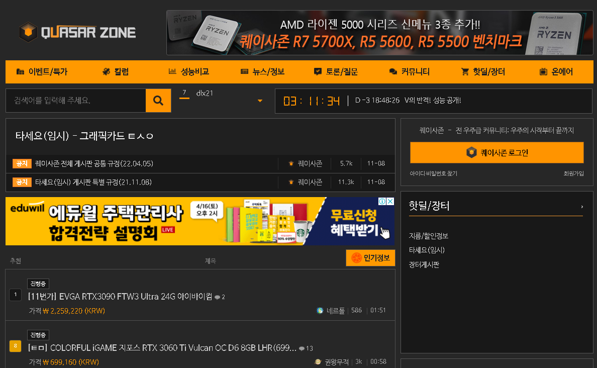 국내 IT 관련 커뮤니티인 퀘이사존이며 핫딜에는 생활용품도 자주 올라오지만 주로 컴퓨터 부품과 주변기기가 올라오며, 타세요 게시판에는 그래픽카드 특가들이 올라옵니다.