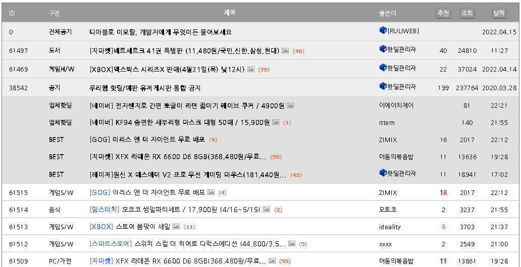 루리웹 - 유저/업체 예판 핫딜 뽐뿌 게시판