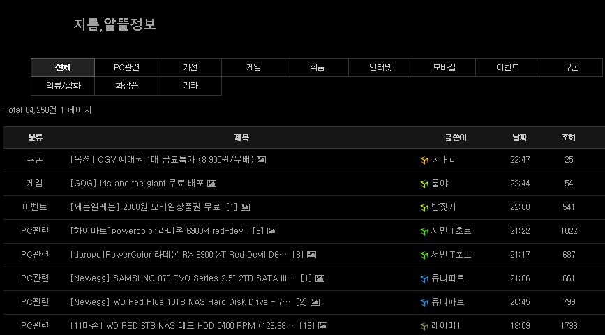하드웨어와 쿨링 관련한 커뮤니티이며 주로 컴퓨터 부품과 주변기기 핫딜이 자주 나옵니다.