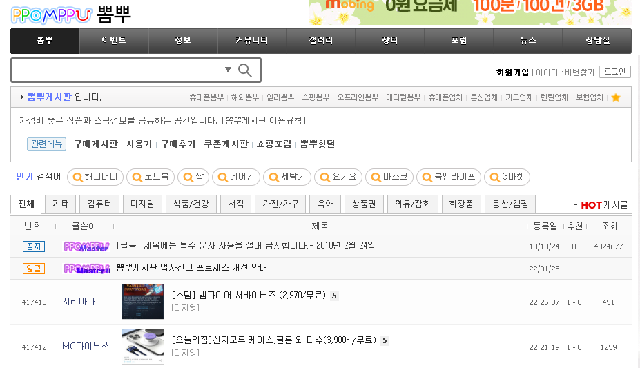 국내에서 유서깊은 핫딜 사이트인 뽐뿌이며 생활용품들과 가전제품, 핸드폰 관련핫딜 등등이 자주 올라옵니다.